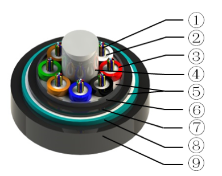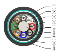 1 光纖、 2 纖膏、 3 松套管、 4 FRP、 5 阻水纜膏、 6 雙面涂塑鋁帶、 7 PE內(nèi)護(hù)套、 8 雙面涂塑皺紋鋼帶、 9 PE外護(hù)套