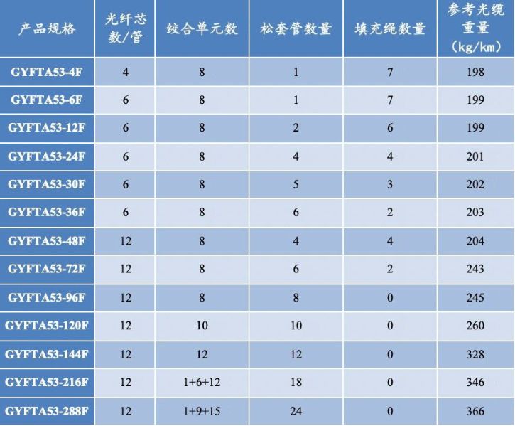 注:1.表中參數(shù)為GYFTA53典型結(jié)構(gòu)參數(shù),我司可提供2~288芯任意規(guī)格或特殊結(jié)構(gòu)參數(shù)的GYFTA53光纜。