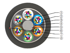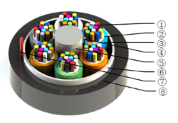 1 光纖、 2 纖膏、 3 松套管、 4 阻水紗、 5 FRP、 6 阻水帶、7 撕裂繩、 8 PE外護(hù)套