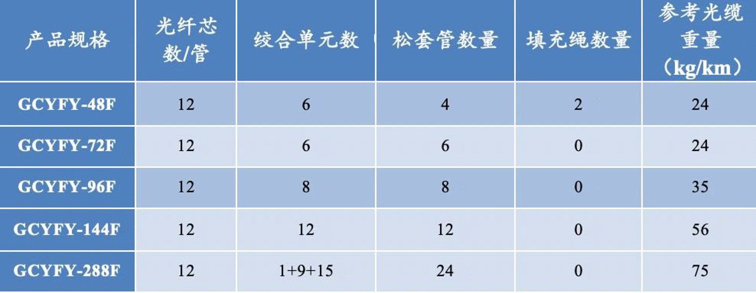 注:1.表中參數(shù)為GYFTY典型結(jié)構(gòu)參數(shù),我司可提供2~288芯任意規(guī)格或特殊結(jié)構(gòu)參數(shù)的GYFTY光纜。