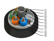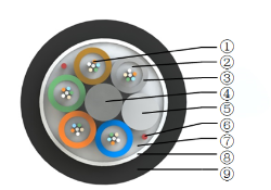1 光纖、 2 纖膏、 3 松套管、 4 中心加強(qiáng)鋼絲、 5 填充繩(可能有)、 6 撕裂繩(可能有)、 7 阻水纜膏、 8 雙面涂塑鋁帶、 9 PE外護(hù)套