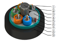 1 光纖、 2 纖膏、 3 松套管、 4 中心加強(qiáng)鋼絲、 5 填充繩(可能有)、 6 撕裂繩(可能有)、 7 阻水纜膏、 8 雙面涂塑鋁帶、 9 PE外護(hù)套