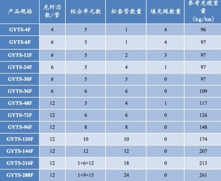注:1.表中參數(shù)為GYFTY典型結(jié)構(gòu)參數(shù),我司可提供2~288芯任意規(guī)格或特殊結(jié)構(gòu)參數(shù)的GYFTY光纜。