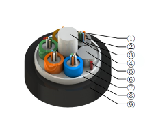 1 光纖、 2 纖膏、 3 松套管、 4 FRP、 5 填充繩(可能有)、6 撕裂繩(可能有)、 7 阻水纜膏、 8 雙面涂塑皺紋鋁帶、 9 PE外護套