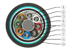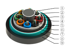 1 光纖、 2 纖膏、 3 松套管、 4 鋼絲、 5 阻水纜膏、 6 雙面涂塑皺紋鋁帶、 7 LSZH內(nèi)護(hù)套、 8 雙面涂塑皺紋鋼帶、 9 LSZH外護(hù)套