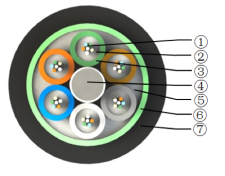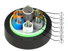 1 光纖、2 纖膏、3 松套管、4 鋼絲加強(qiáng)件、5 阻水纜膏、6 雙面涂塑皺紋鋼帶、 7 LSZH外護(hù)套