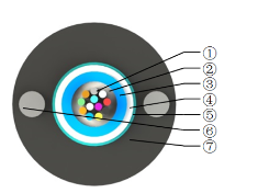 1 光纖、 2 纖膏、 3 松套管、 4 阻水纜膏、 5 雙面涂塑鋼帶、 6 平行鋼絲加強件、 7 LSZH外護套