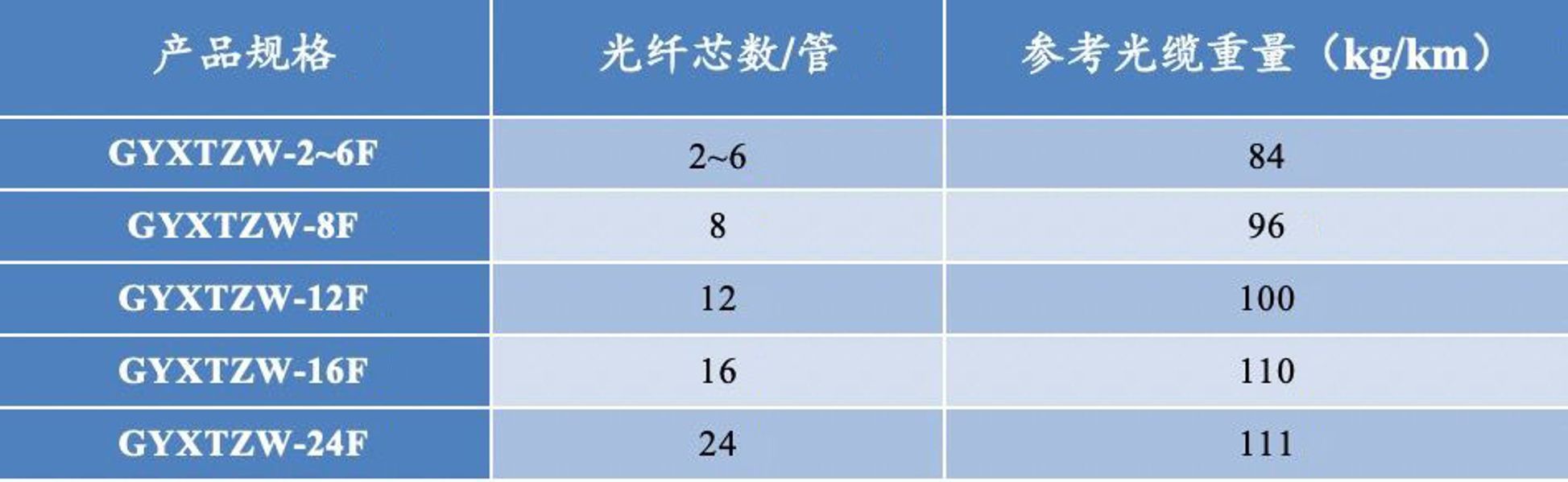 注:1. 表中參數(shù)為GYXTZW典型結(jié)構(gòu)參數(shù),我司可提供2~24芯任意規(guī)格或特殊結(jié)構(gòu)參數(shù)的GYXTZW光纜。