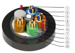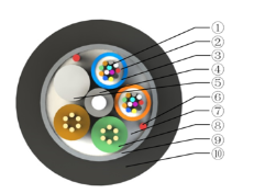 1 光纖、 2 纖膏、 3 松套管、 4 鋼絲加強(qiáng)件、5 填充繩(可能有)、 6 撕裂繩(可能有)、7 阻水纜膏、 8 銅導(dǎo)線、 9 雙面涂塑鋁帶、 10 PE外護(hù)套