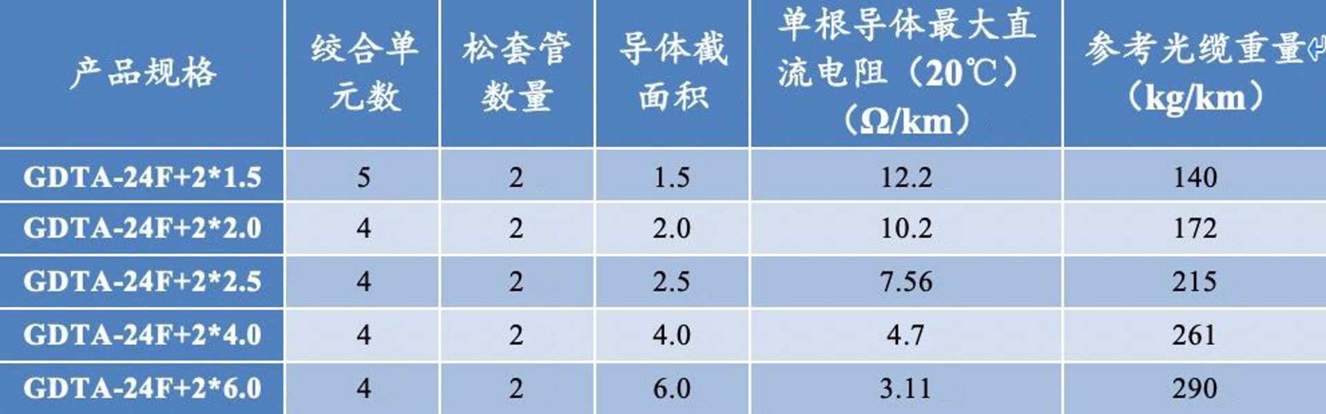 注:1. 表中參數(shù)為GDTA(S)典型結(jié)構(gòu)參數(shù),我司可提供2~48芯任意規(guī)格或特殊結(jié)構(gòu)參數(shù)的GDTA(S)光纜。