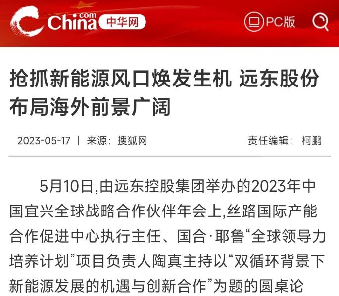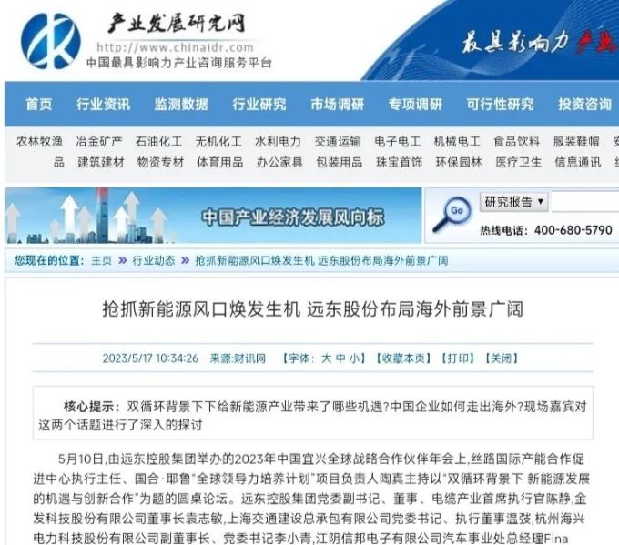 5月10日,遠(yuǎn)東控股集團(tuán)召開“2023中國(guó)宜興·遠(yuǎn)東全球戰(zhàn)略伙伴年會(huì)”,會(huì)議針對(duì)當(dāng)下行業(yè)熱點(diǎn)展開圓桌論壇,受到中華網(wǎng)、中國(guó)產(chǎn)業(yè)發(fā)展研究網(wǎng)、中國(guó)快訊網(wǎng)等多家媒體報(bào)道。