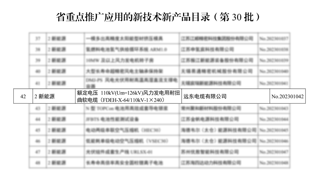 遠(yuǎn)東《額定電壓110kV(Um=126kV)風(fēng)力發(fā)電用耐扭曲軟電纜(FDEH-X-64/110kV-1×240)》項(xiàng)目成功入選“江蘇省第30批推廣應(yīng)用新產(chǎn)品新技術(shù)”。